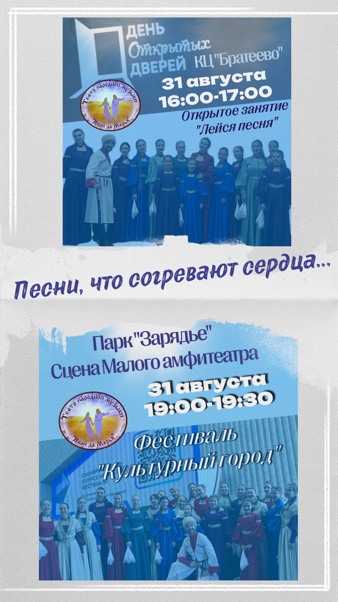 31 Августа Московский городской творческий коллектив «Театр народной музыки «Иван да Марья» провёл открытую репетицию «Лейся песня» для посетителей Культурного центра «Братеево» в рамках Дня открытых дверей.